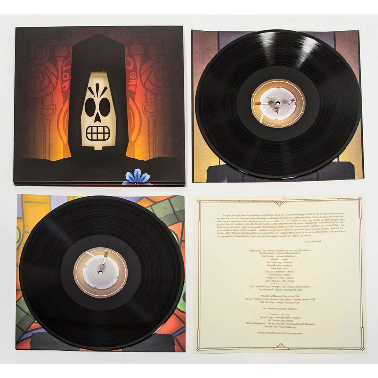 Jazz isn’t dead. Well, actually, in this case, it is… but in the most thematically appropriate way. To celebrate the quarter-century anniversary of Manny’s odyssey through the afterlife, we’re repressing the Grim Fandango 2xLP Vinyl Soundtrack, originally released five years ago for the game’s 20th birthday. Composer Peter McConnell’s trumpet-y and rambunctious big band lounge act can finally be heard the way it was always intended – on vintage black vinyl. Real human orchestras were rarely used for video game music back in the 90s, but in this Remastered Director’s Cut, every note was re-recorded and performed by actual fleshy people. The results are foot-tapping and chill, turning your living room into a veritable smokey club (smoke not included).